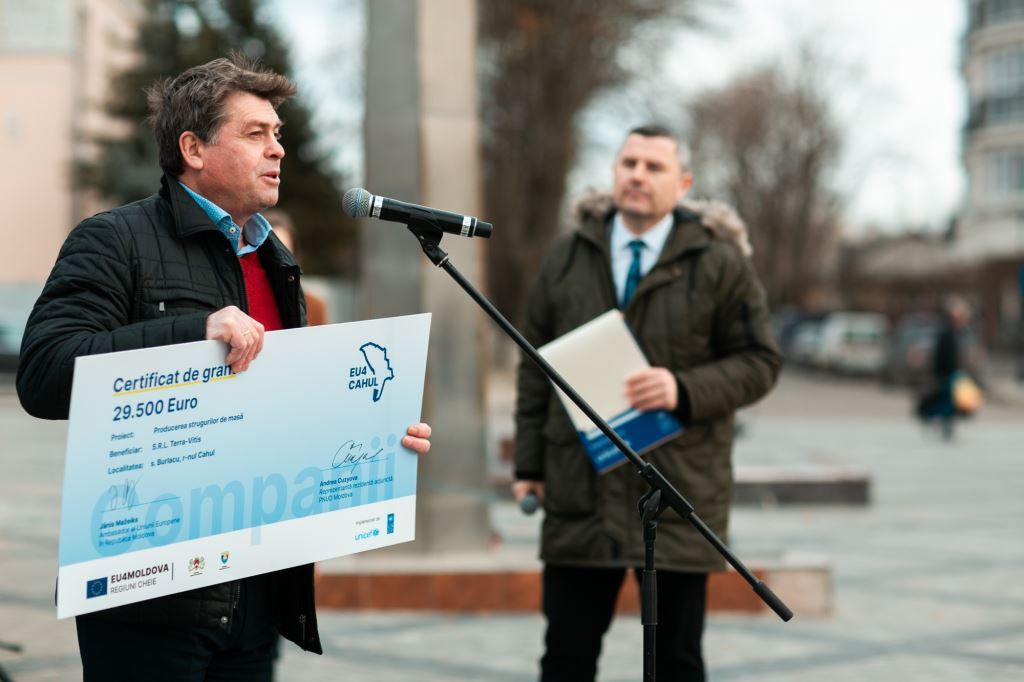 14 antreprenori din regiunea Cahul au primit granturi în valoare de la 15.000 până la 30.000 euro fiecare, asistență oferită de Uniunea Europeană pentru dezvoltarea sectorului privat în cadrul celui de-al doilea apel de granturi lansat de Programul „EU4Moldova: Regiuni-cheie”, implementat de PNUD și UNICEF. Totodată, au fost oferite certificate de grant în valoare de până la 20.000 euro fiecare pentru două organizații non-guvernamentale și suport în valoare de 1620 euro fiecare pentru trei asociații obștești din regiunea Cahul.