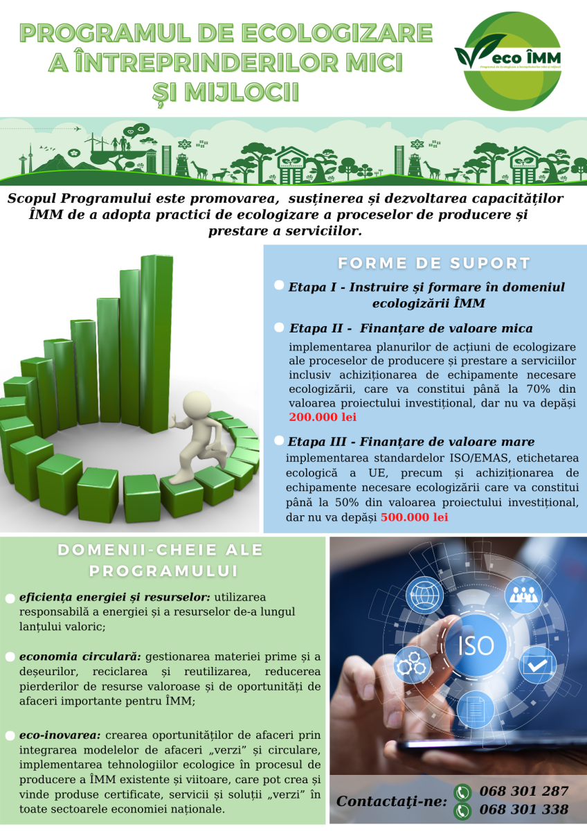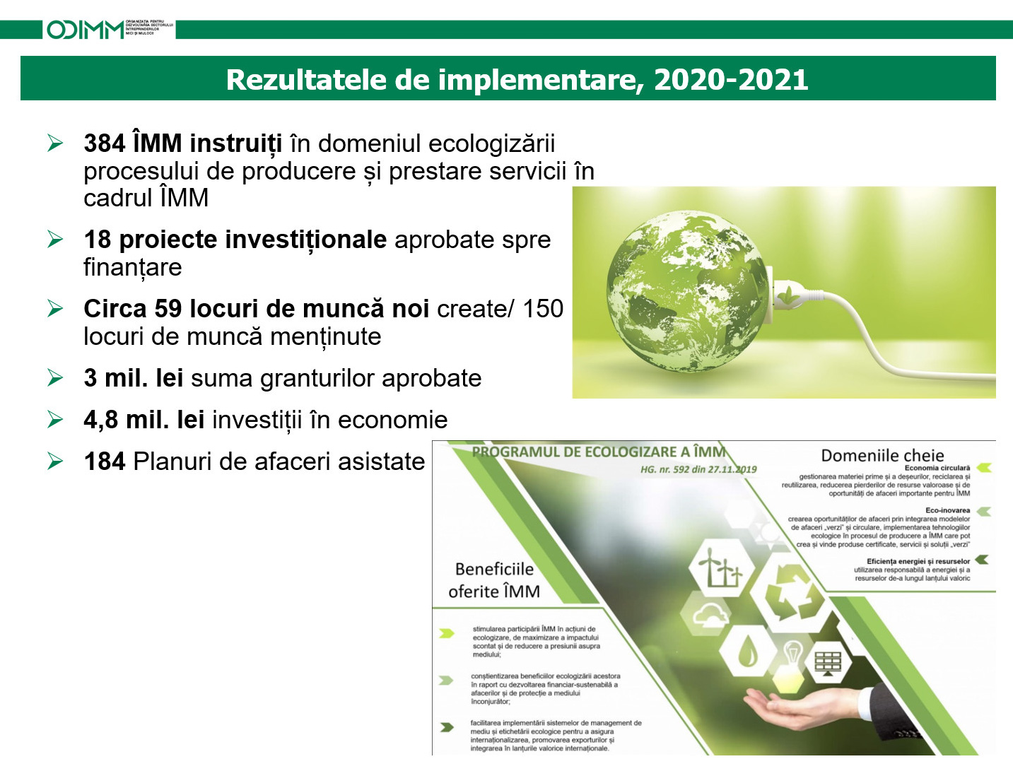 Suma finanțării nerambursabile oferite de stat celor 29 de afaceri prin intermediul Programului de ecologizare a ÎMM va constitui circa 4,9 milioane lei. Valoarea totală a investițiilor pentru implementarea acțiunilor de ecologizare asumate de aceste companii este de circa 5 milioane lei și crearea a circa 100 locuri noi de muncă. Proiectele investiționale selectate spre finanțare țintesc adoptarea practicilor ecologice, din domeniile utilizării responsabile a energiei, a resurselor de-a lungul lanțului valoric, precum și gestionarea materiei prime, reciclarea deșeurilor și reutilizarea acestora.