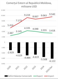 În paralel, importurile cresc constant, atingând în aprilie 2025 valoarea de 9,54 miliarde USD. Ioniță avertizează că, în ritmul actual, Republica Moldova va depăși pentru prima dată în istorie pragul de 10 miliarde USD la importuri în lunile următoare.