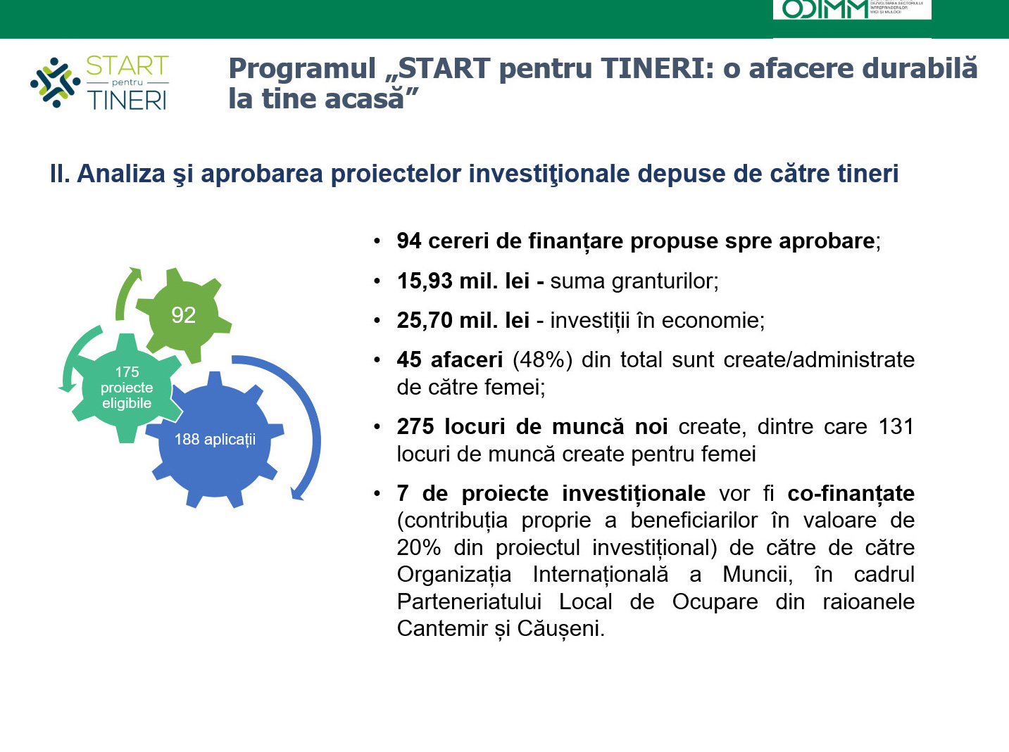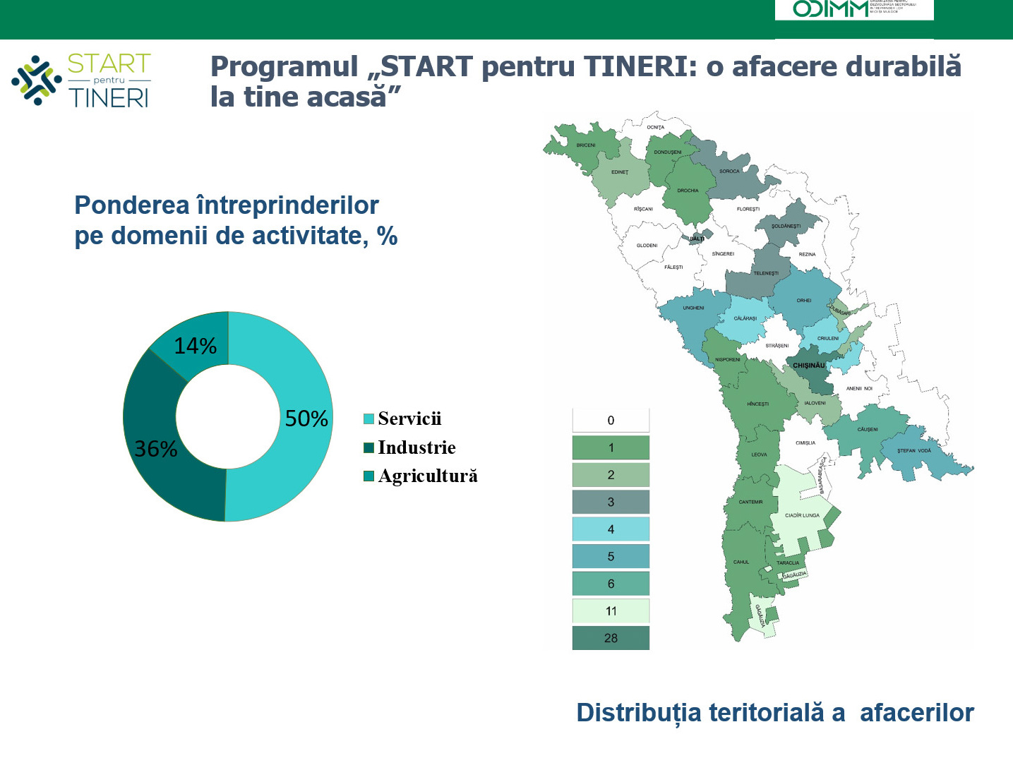 Din numărul de 94 de proiecte investiționale acceptate pentru finanțare, 45 de afaceri sunt create/administrate de către femei. Circa 67% din afacerile create de tineri vor fi desfășurate în zonele rurale. Cele mai active localități fiind mun. Chișinău, UTA Găgăuzia, Căușeni, Ungheni, Cahul, Ștefan-Vodă și Orhei. Companiile ce urmează a fi create vizează domeniile: prestarea serviciilor (48%), o treime din afaceri (34%) vor activa în domeniul industriei prelucrătoare, iar alte 13% din afaceri își vor desfășura activitatea în agricultură și zootehnie.