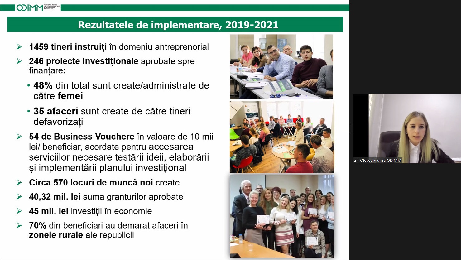 Pe parcursul implementării Programului, 1459 de tineri au fost instruiți în domeniul antreprenorial și ghidați în elaborarea proiectelor investiționale, iar 300 proiecte investiționale au fost aprobate pentru finanțare, dintre care 246 proiecte investiționale sub formă de grant și 54 proiecte investiționale sub formă de Business Voucher. Totodată, au fost realizate 31 de Hackathoane în toate regiunile țării, pentru a stimula creativitatea tinerilor din toată țara privind generarea ideilor și identificarea celor mai viabile și inovatoare potențiale idei de afaceri.
