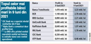 Câştigurile celor mai profitabile 5 bănci din România depăşesc 4,8 mld. Lei (969 mil. de euro), adică peste 75% din câştigul total al sistemului. Întregul sistem bancar românesc, format din 34 de bănci, a încheiat 9 luni/2021 cu un profit record, de 6,4 mld. Lei (1,2 miliarde de euro ), cu 36% peste câştigul din 9 luni/2020, potrivit datelor BNR, citate de Ziarul Financiar.