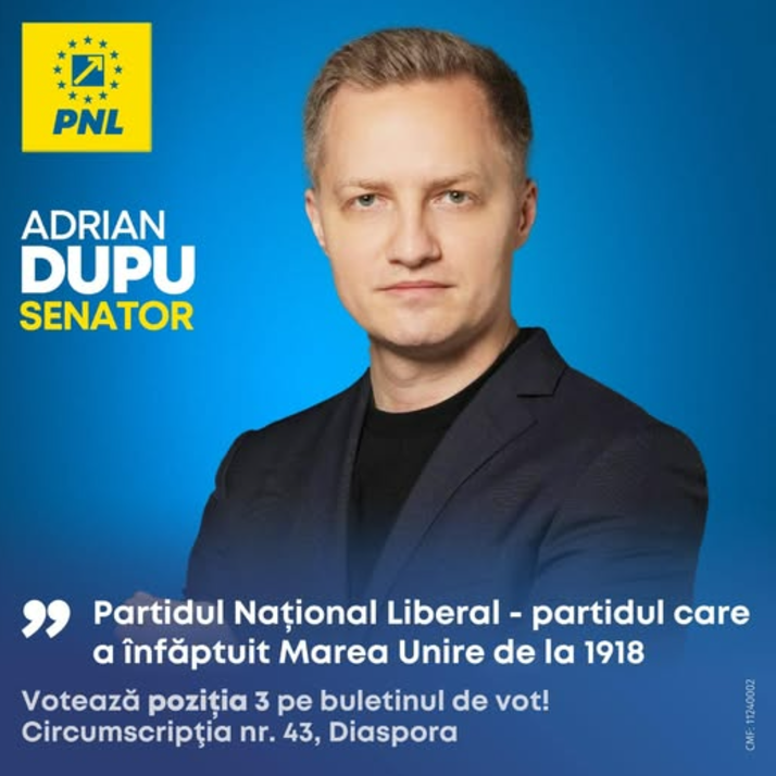 „Pe 1 Decembrie, haideți să ne arătăm dragostea de țară ieșind la vot, votând pentru a păstra democrația, apartenența la Uniunea Europeană și la NATO, votând pentru a ne păstra libertatea și unitatea pentru care au murit înaintașii noștri!”. Este mesajul candidatului Partidului Național Liberal, Adrian Dupu, la funcția de senator pentru diaspora. Într-un mesaj publicat pe Facebook, Dupu îndeamnă românii de pe ambele maluri ale Prutului să iasă la vot și să voteze conștient.