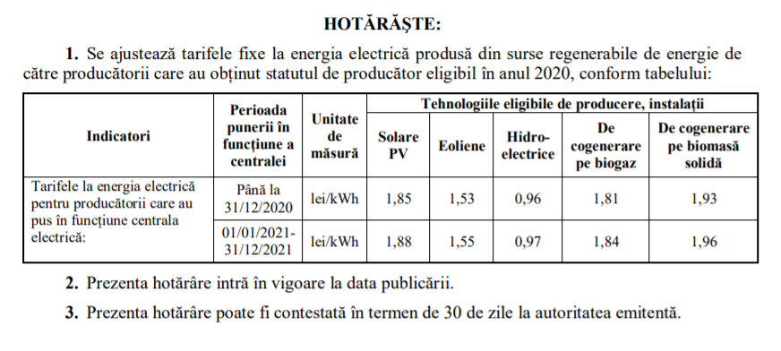 Tarifele diferă în funcție de centrala electrică. Astfel, tariful pentru energia generată de panourile solare a crescut de la 1,85 lei până la 1,88 lei. Prețul pentru energia produsă de stațiile eoliene va fi de 1,55 lei, comparativ cu 1,53 lei pe kWh.