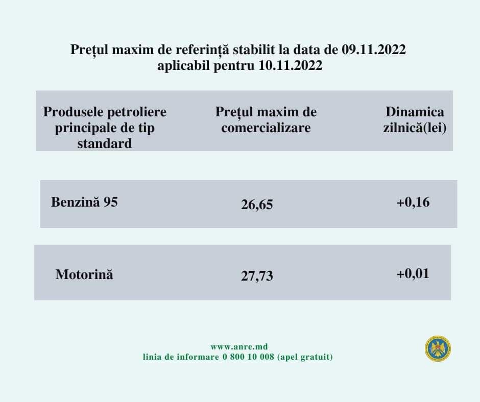 De menționat că, de la 1 septembrie 2021 au intrat în vigoare modificările la legea produselor petroliere. Așadar, ANRE stabilește prețurile plafon pentru benzina cu cifra octanică 95 și pentru motorină.