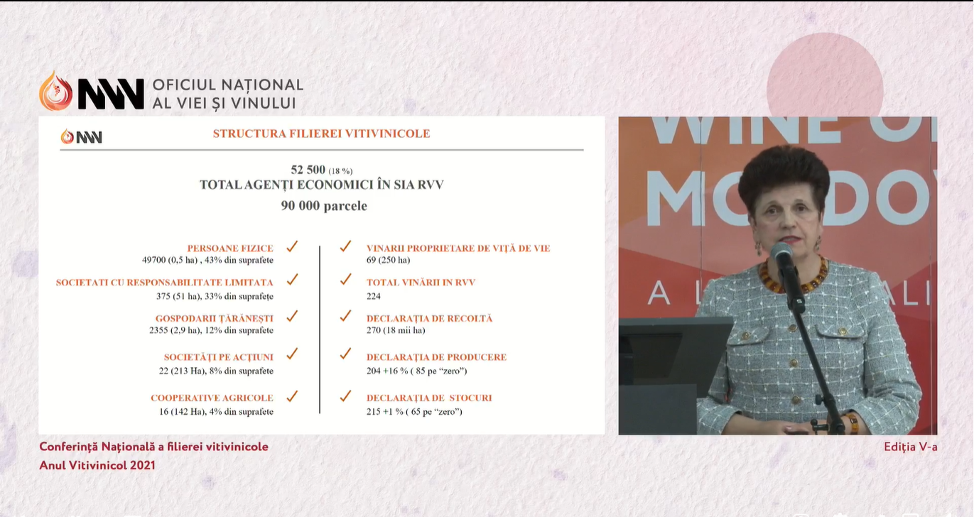 Elizaveta Breahnă, directoarea ONVV, a prezentat raportul de conjunctură vitivinicolă. În registrul vitivinicol al ONVV sunt înregistrați 52 500 de agenți economici, cu 18% mai mult decât în 2020, care dețin 90 000 de parcele – plantații viță de vie atât soiuri pentru vin cât și soiuri de masă. Potrivit raportului în Republica Moldova există 224 de vinării.