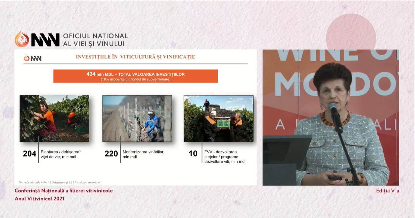 De asemenea, în anul 2021, în viticultură și vinificație au fost investite 434 milioane de lei, dintre care 18% au fost acoperite de fondul de subvenționare. 204 milioane de lei au fost redirecționate către plantarea sau defrișarea plantațiilor de viță de vie, alte 220 de milioane de lei au fost folosite pentru modernizarea vinăriilor, iar 10 milioane de lei pentru dezvoltarea piețelor.