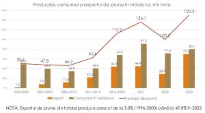 Prunele moldovenești au înregistrat performanțe remarcabile în 2023, atingând mai multe recorduri istorice. Potrivit expertului în politici economice de la Institutul pentru Dezvoltare și Inițiative Sociale (IDIS) „Viitorul”, Veaceslav Ioniță, exporturile de prune au crescut semnificativ, reprezentând 47% din producția totală, comparativ cu doar 3% în anii 2000. Aceasta echivalează cu aproximativ 70 de mii de tone exportate.