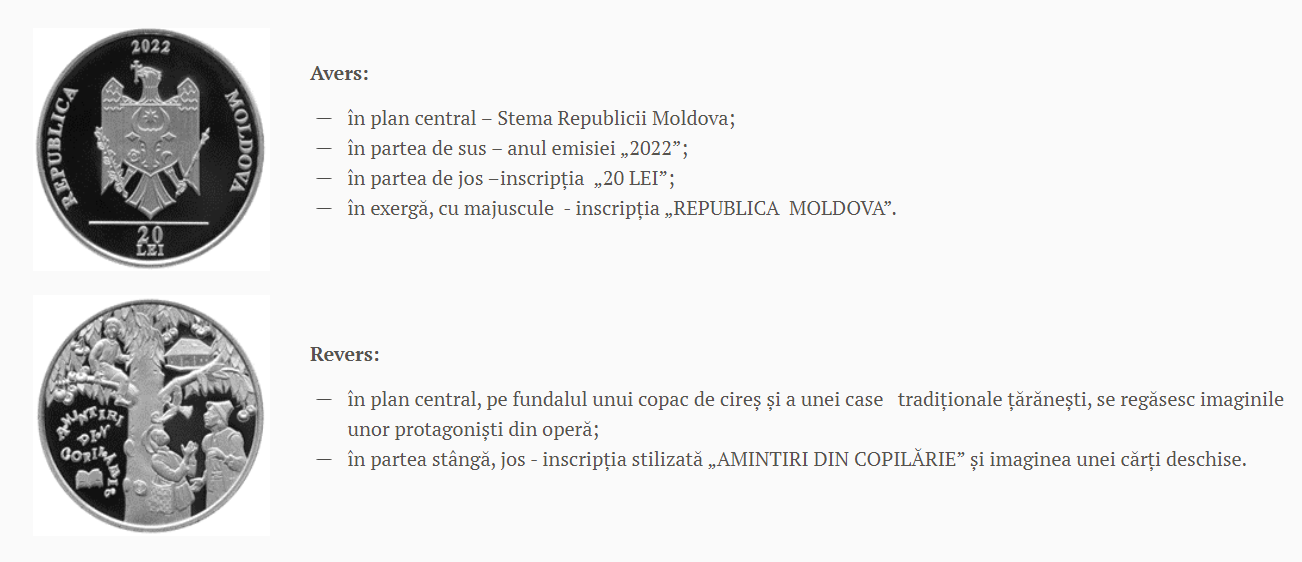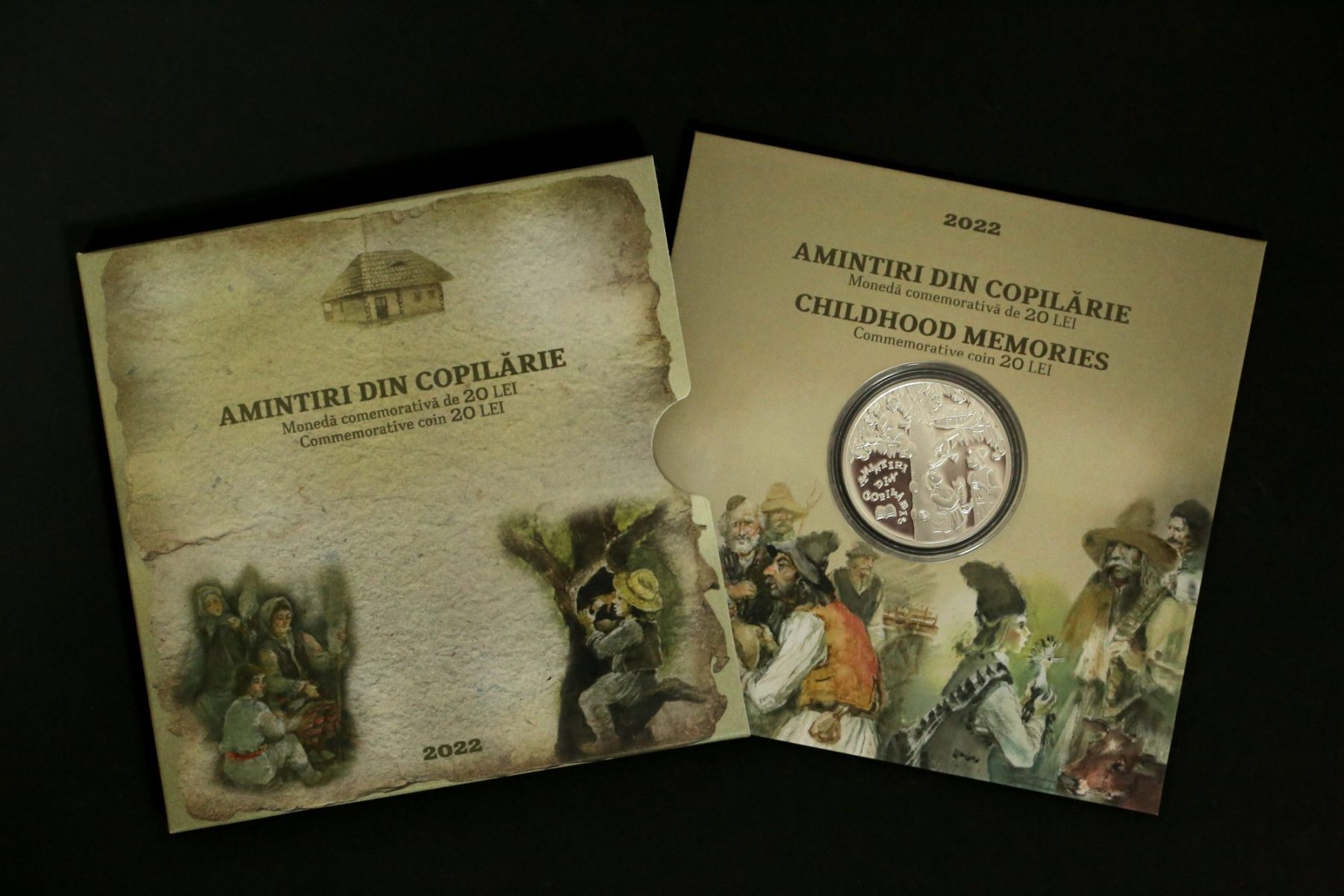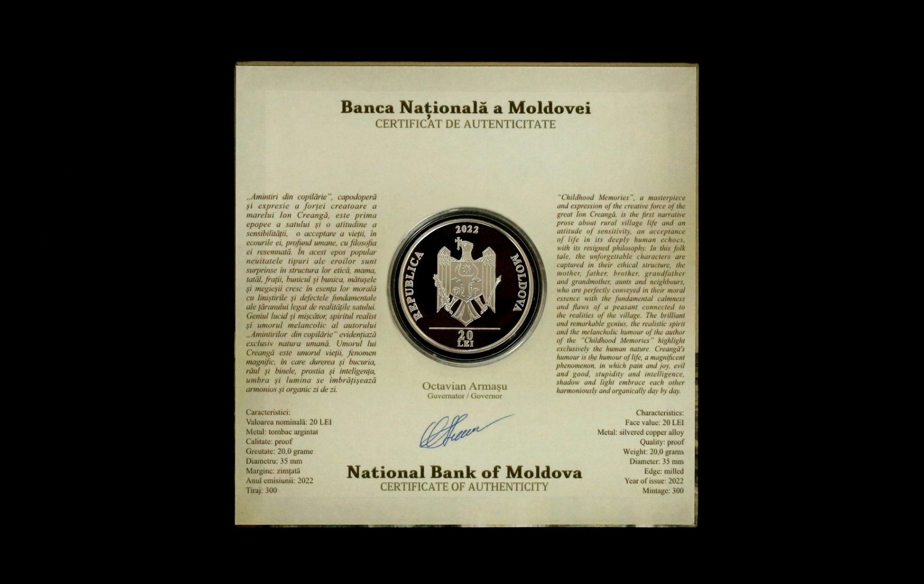 Seria „Poveștile copilăriei” va  include o nouă monedă din tombac argintat  dedicată capodoperei „Amintiri din copilărie” – expresie admirabilă a forței creatoare a povestitorului Ion Creangă. Moneda are valoarea nominală de 20 de lei și este emisă într-un tiraj de 300 de unități.