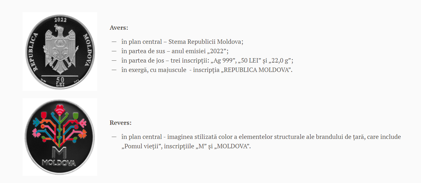 Șirul noilor monede comemorative din anul  2022 e completat cu moneda de argint dedicată brandului de țară „Pomul vieții”. Simbolul reprezintă continuitatea și modernizarea țării noastre, fiecare ramură a pomului sugerând unul din sectoarele strategice ale economiei Republicii Moldova. Moneda cu valoare nominală de 50 de lei va avea un tiraj de 1500 de unități.