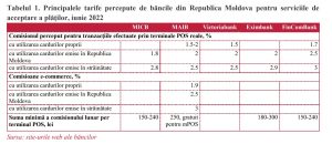 Comisioanele percepute de băncile din Republica Moldova de la comercianți pentru tranzacţiile efectuate cu utilizarea cardurilor proprii variază între 1.5 și 2% din valoarea tranzacției. În cazul utilizării cardurilor emise de alte bănci din Republica Moldova, comisioanele reprezintă 1.8-2.5%, iar pentru plățile cu carduri emise în străinătate se percep comisioane de2.5-3%, potrivit unei analize economistului Marina Soloviova de la Expert Grup.