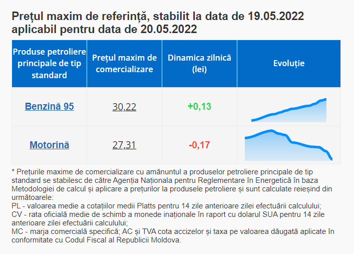 De menționat că, de la 1 septembrie 2021 au intrat în vigoare modificările la legea produselor petroliere, iar ANRE stabilește prețurile plafon pentru benzina cu cifra octanică 95 și pentru motorină.