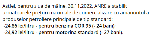 Potrivit informațiilor, mâine, 30 noiembrie, benzina se va ieftini cu 0,24 lei, iar motorina cu 0,27 lei. Mai exact, litrul de benzină va costa 24,86 lei, iar litrul de motorină 24,92 lei.
