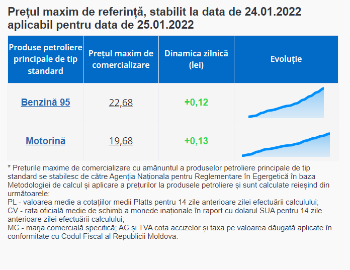 Astfel, mâine, 25 ianuarie 2022, litrul de benzină va costa 22,68 de lei, iar cel de motorină – 19,68 lei.