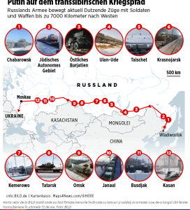 „Calea ferată transsiberiană este o rețea importantă de transport militar dintr-o parte în cealaltă a Rusiei. Un tren militar face șase-șapte zile până ajunge din Orientul Îndepărtat al Pacificului în vestul Rusiei. Trenurile din Siberia parcurg distanța în doar două-trei zile”, a declarat pentru BILD expertul irlandez în domeniul apărării Andy Scollick.
