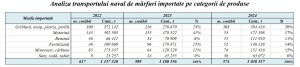 Importurile pe cale navală au înregistrat o ușoară scădere în 2024. Numărul de nave a scăzut la 574, cu un volum total de 1,038 milioane de tone, în scădere față de 1,180 milioane de tone în 2023. Importurile de griblură, nisip, pietriș și perlit au crescut însă, ajungând la 394.000 de tone, reprezentând 38% din totalul mărfurilor importate.