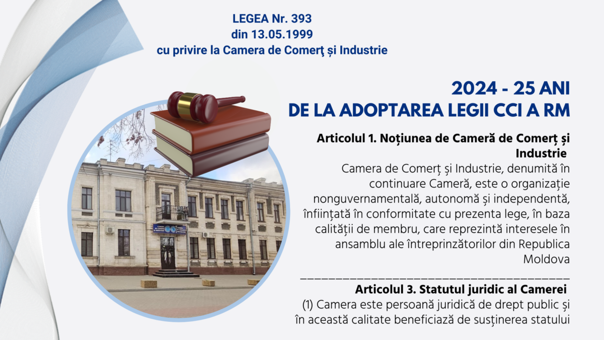 La data de 13 mai 1999, Parlamentul Republicii Moldova a adoptat „Legea cu privire la Camera de Comerț și Industrie”, atribuind Camerei statutul de organizație nonguvernamentală, autonomă şi independentă, care reprezintă interesele întreprinzătorilor din Republica Moldova.