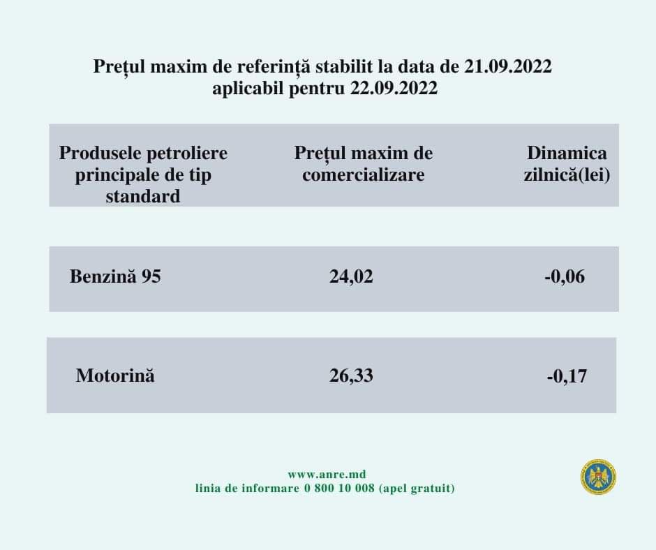 De menționat că, de la 1 septembrie 2021 au intrat în vigoare modificările la legea produselor petroliere. Așadar, ANRE stabilește prețurile plafon pentru benzina cu cifra octanică 95 și pentru motorină.