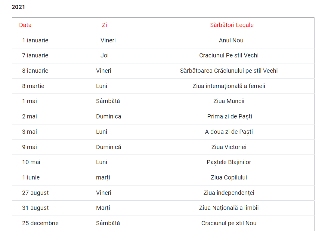 Conform legislației, în Moldova sunt 12 sărbători oficiale pentru care bugetarii primesc zile libere. În anul 2022, șase dintre aceste sărbători coincid cu zilele de weekend, astfel în plus la cele 104 zile libere se mai adaugă doar 6 zile și, într-un final, reiese că moldovenii vor avea în anul următor 110 zile de odină și 255 de zile lucrătoare. Reamintim că în afară de aceste zile, fiecare cetățean al Republicii Moldova are dreptul la un concediu de 28 de zile anual plătit.