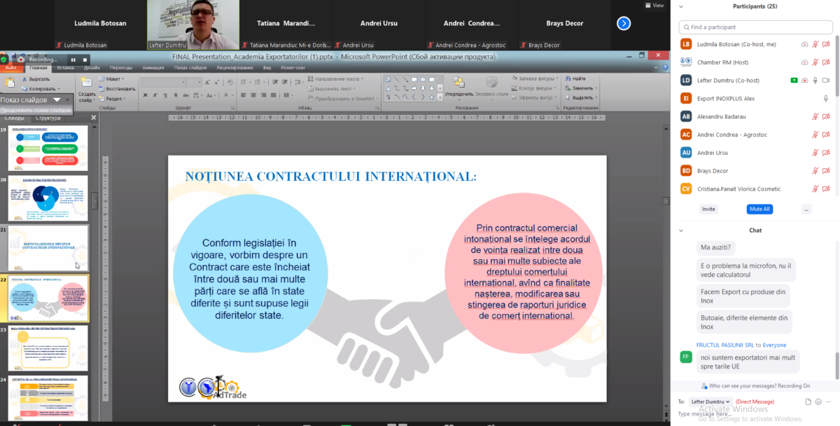 „În contextul crizei provocate de războiul din Ucraina, Moldova se confruntă cu un val mare de refugiați, precum și cu creșterea prețurilor la resursele energetice și blocarea rutelor comerciale. Motiv pentru care întreprinderile mici și mijlocii, care încă nu și-au revenit după pandemie, trebuie să facă față noilor dificultăți de ordin financiar, comercial și logistic. Proiectul AdTrade a adaptat agenda ”Academiei exportatorilor” cu subiecte care ar spori capacitățile managerilor și echipelor de export de a re-negocia contracte în situații de criză, a valorifica pe deplin avantajele acordurilor semnate de Moldova cu Uniunea Europeană, Marea Britanie și alte țări și de a se asocia pentru a exporta în comun și a identifica noi piețe de desfacere”, a menționat Natalia Iachimov, ofițeră a proiectului AdTrade.