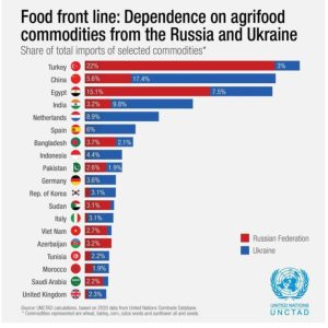 De exemplu, ponderea importurilor din Federaţia Rusă şi Ucraina – ca procent din totalul importurilor de grâu, porumb, orz, colza, ulei de floarea soarelui şi seminţe – este de 25,9% pentru Turcia, 23% pentru China şi 13% pentru India.