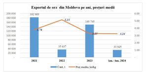 În 2023, Republica Moldova a exportat 149 745 tone de orz, de 4,2 ori mai mult față de 2022, când au fost exportate 35 637 tone. Totuși, cantitatea exportată în 2023 este cu 18,1% mai mică comparativ cu 2021, când s-au exportat 182 863 tone. Prețul mediu de export al orzului în 2023 a atins cel mai scăzut nivel din ultimii trei ani, fiind de 3,25 lei/kg. În primul semestru 2024, prețul mediu a rămas practic la același nivel – 3,24 lei/kg. Cantitatea exportată în primul semestru 2024 este de 33 925 tone, de 2 ori mai mult ca în perioada similară a anului precedent.