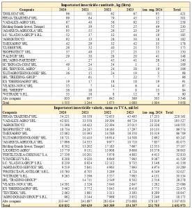 Din punct de vedere cantitativ, companiile DIOLSEM SRL (95 t), CLEBER SRL (55 t, insecticide de uz casnic), Holdingul Grando Invest Tiraspol (49 t) și IMEXAGRO SRL (33 t) domină piața în 2024. În clasamentul valoric, cele mai mari importuri sunt realizate de VADALEX-AGRO SRL (33 milioane lei), AGROSTOC CI (23,3 milioane lei) și DIAZCHIM SRL (17,2 milioane lei).