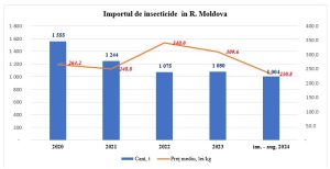 Anual, Republica Moldova importă între 1.000 și 1.500 de tone de insecticide, iar datele din perioada ianuarie-august 2024 indică un preț mediu de import de 230,8 lei/kg, în scădere cu 25% față de 2023 și cu 32% comparativ cu 2022 (340 lei/kg). Această tendință reflectă orientarea spre produse mai accesibile, inclusiv importuri de substanțe active fără brand din China, conform analizei lui Iurie Rija, director executiv al Asociației „Agrocereale”.