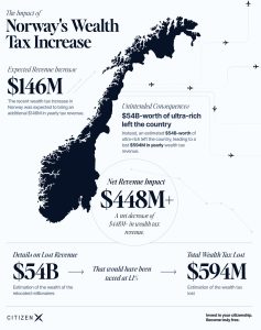 Creșterea recentă a taxei pe avere în Norvegia, menită să aducă 146 milioane de dolari în plus la bugetul de stat anual, a avut un efect complet opus: cei mai bogați cetățeni ai țării, cu o avere estimată la 54 de miliarde de dolari, au părăsit țara.