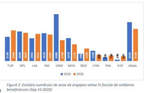 Prin comparație, potrivit informațiilor furnizate de către aceeași instituție, în cursul anului 2020 au fost eliberate, în total, 27.450 avize de angajare/detașare, iar din contingentul de 30.000 de lucrători străini nou-admiși pe piața forței de muncă în anul 2020 au fost eliberate 22.304 avize de angajare/detașare, (cu aproximativ 7.000 mai puțin față de anul 2019). Conform datelor comunicate de Inspecția Muncii, numărul de contracte de muncă nou înregistrate de angajatori români pentru salariați cetățeni ai unor state din afara Uniunii Europene sau state membre ale Spațiului Economic European, respectiv ai Confederației Elvețiene, în perioada de referință 01.01.2021-12.10.2021, a fost de 36.265. Pentru comparație, numărul de contracte de muncă nou înregistrate de angajatori români pentru salariați cetățeni străini non UE, SEE sau Confederația Elvețiană, în anul 2020 a fost de 25.683, iar în anul 2019 de 28.954.