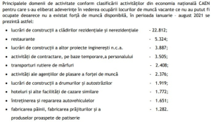 Cei 100.000 de muncitori vor acoperi deficitul de forţă de muncă înregistrat în domenii precum construcţiile de clădiri, de drumuri, transporturi rutiere, restaurante, hoteluri, panificaţie şi altele, potrivit comunicatului. Numărul este dublu comparativ cu anul precedent. Pentru anul 2021, iniţial a fost stabilit un contingent de 25.000 de lucrători străini nou-admişi pe piaţa forţei de muncă, care a fost suplimentat ulterior la 50.000 de persoane, printr-o nouă hotărâre de Guvern.