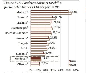 La nivelul sistemului financiar, ponderea creditelor persoanelor fizice în PIB a înregistrat o creștere similară, constituind la finele anului de raportare 13,3 la sută. Creditarea bancară a persoanelor fizice raportată la PIB a scăzut cu 0,7 p.p comparativ cu finele anului 2021, fiind la nivelul de 8,8 la sută la sfârșitul anului 2022. În comparație cu alte state din regiune, precum și cu media europeană, creditarea persoanelor fizice din Republica Moldova înregistrează valoare inferioară, urmând tendința descrescătoare similar majorității cazurilor observate.