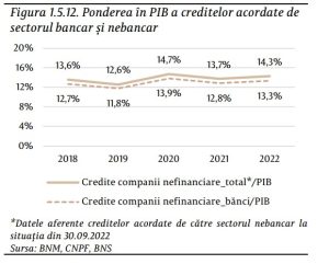Creditarea sectorului companiilor nefinanciare în anul 2022 a fost dominată în continuare de sectorul bancar, concomitent cu temperarea ritmului de creștere a volumului creditelor acordate de către sectorul de creditare nebancară.