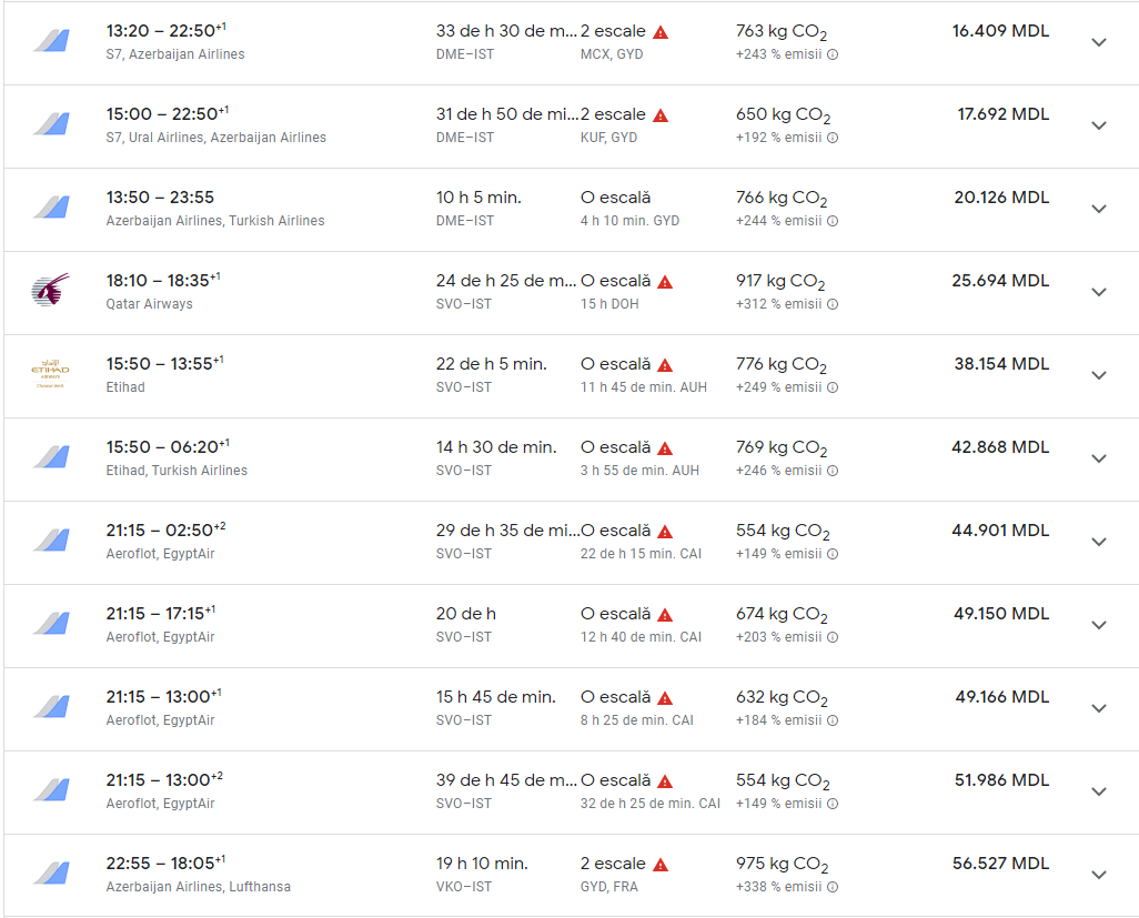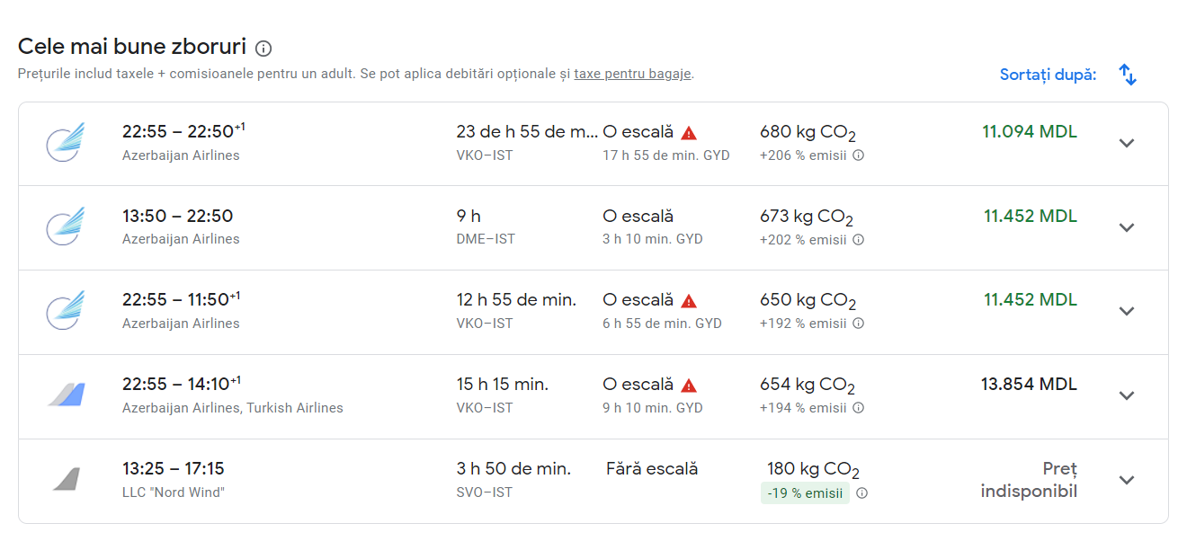 Am verificat care sunt prețurile pentru un zbor către aceste destinații. De exemplu, pentru mâine, 4 martie, prețul pentru un bilet cursa Moscova-Chișinău începe de la 11.094 lei și poate ajunge la 56.527 lei.