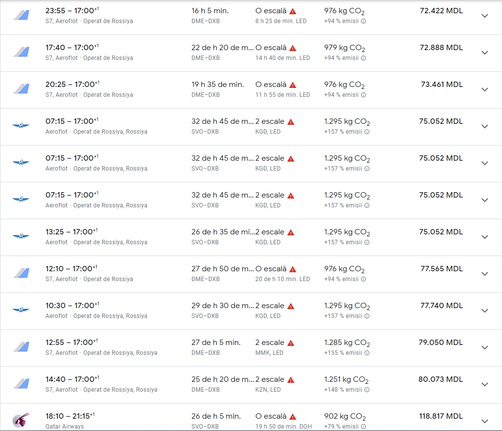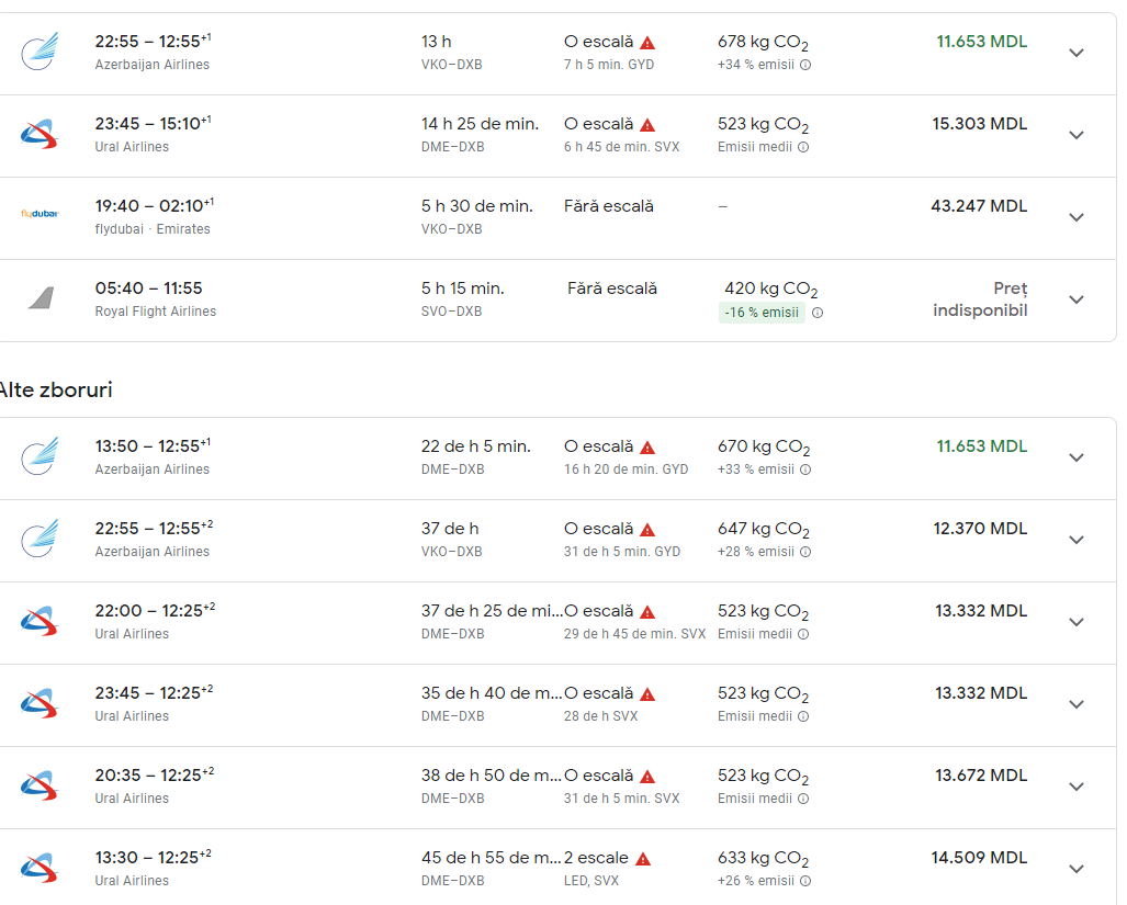 Scumpe sunt și zborurile dinspre Moscova spre Dubai. Prețul pentru un zbor Moscova-Dubai începe de la 11.653 lei și ajunge chiar și la 118.817 lei.