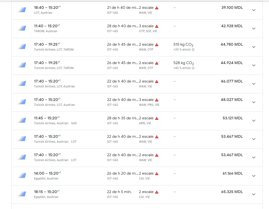 Un bilet de la Istanbul la Iași costă între 4.318 lei și 65.325 lei.