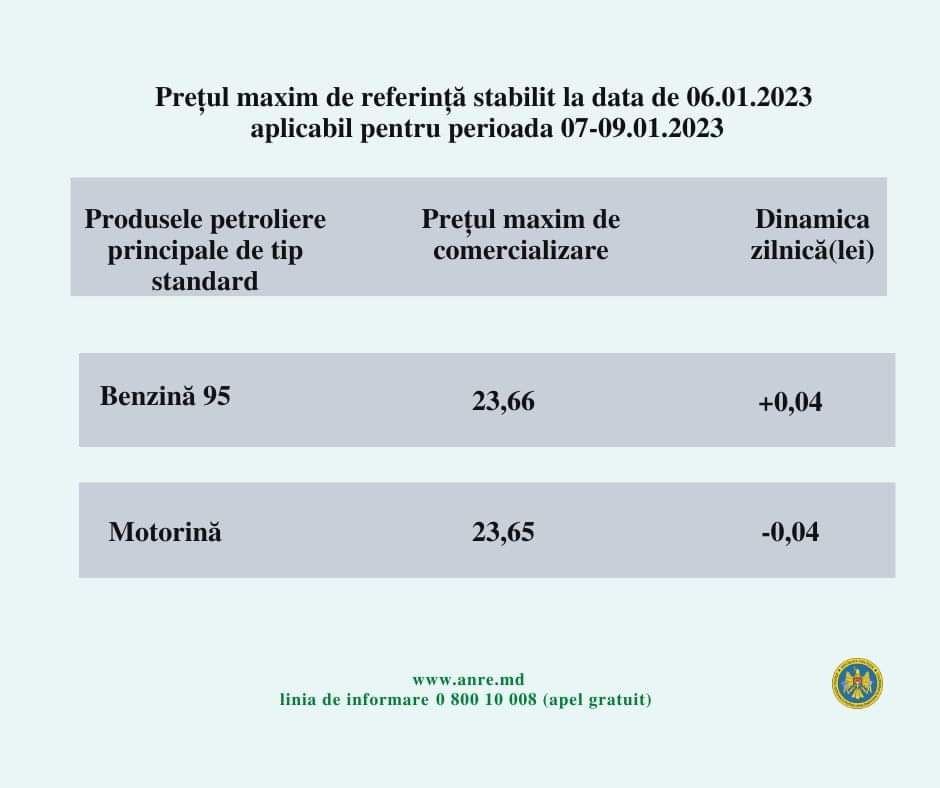 De menționat că, de la 1 septembrie 2021 au intrat în vigoare modificările la legea produselor petroliere. Așadar, ANRE stabilește prețurile plafon pentru benzina cu cifra octanică 95 și pentru motorină.