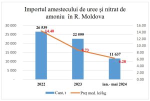 Importurile de amestec de uree și nitrat de amoniu în Republica Moldova au înregistrat o scădere semnificativă în ultimul an, reflectând o cerere mai redusă și ajustări ale prețurilor. În ciuda unei reduceri de preț cu 40%, de la 14,4 lei/kg în 2022 la 8,73 lei/kg în 2023, acest fertilizant a înregistrat un volum importat de 11,6 mii de tone în primele 5 luni ale anului curent, cu o scădere de 29,4% față de aceeași perioadă din 2023 și de 56,1% față de 2022, potrivit analizei realizate de Iurie Rija, directorul executiv al Asociației Exportatorilor și Importatorilor de Produse Agricole și Cerealiere „Agrocereale”.