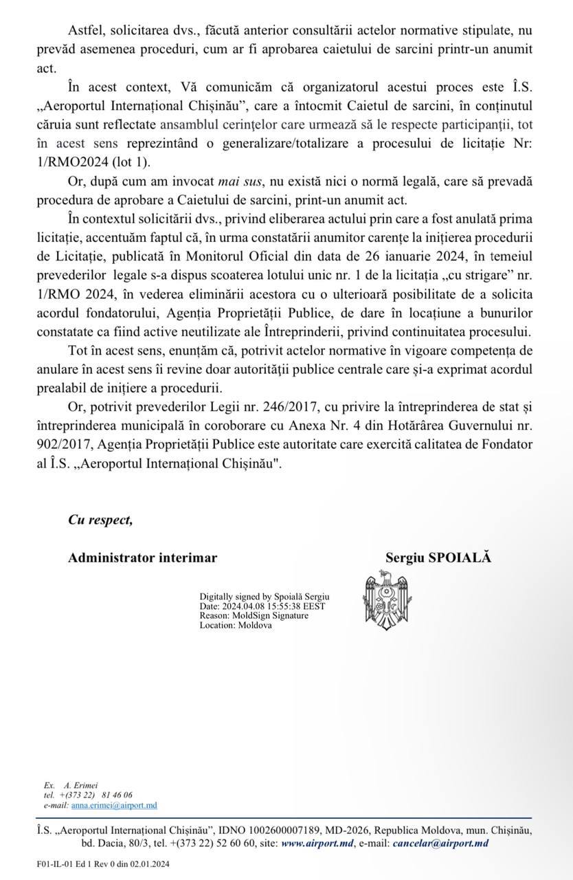 El a precizat că a expediat, în 4 aprilie, o scrisoare către Aeroportul Internațional Chișinău, în care a solicitat informații despre comisia care desfășoară licitația și despre autorii caietului de sarcini. În răspunsul primit din partea noului administrator interimar al întreprinderii, Sergiu Spoială,activistul este îndemnat să rabde până la finalizarea concursului, ca să nu fie intimidați sau influențați membrii comisiei de licitație. De asemenea, Spoială a recunoscut că de elaborarea caietului de sarcini nu răspunde nimeni la modul concret, ci Aeroportul Internațional Chișinău. Nici la întrebarea despre cine a decis anularea concursului nu a fost oferit un răspuns concret.