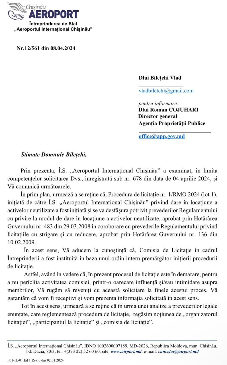 El a precizat că a expediat, în 4 aprilie, o scrisoare către Aeroportul Internațional Chișinău, în care a solicitat informații despre comisia care desfășoară licitația și despre autorii caietului de sarcini. În răspunsul primit din partea noului administrator interimar al întreprinderii, Sergiu Spoială,activistul este îndemnat să rabde până la finalizarea concursului, ca să nu fie intimidați sau influențați membrii comisiei de licitație. De asemenea, Spoială a recunoscut că de elaborarea caietului de sarcini nu răspunde nimeni la modul concret, ci Aeroportul Internațional Chișinău. Nici la întrebarea despre cine a decis anularea concursului nu a fost oferit un răspuns concret.