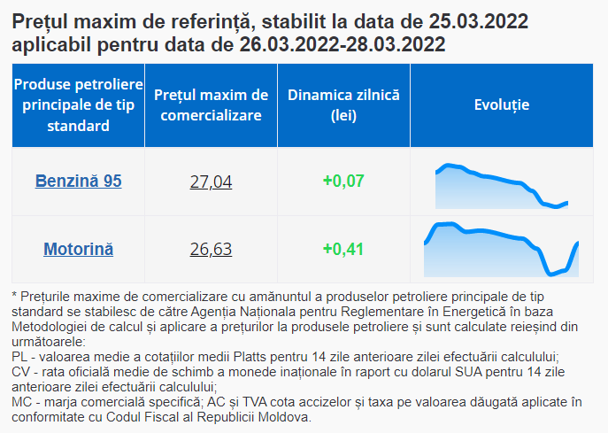 De menționat că, de la 1 septembrie 2021 au intrat în vigoare modificările la legea produselor petroliere, iar ANRE stabilește prețurile plafon pentru benzina cu cifra octanică 95 și pentru motorină.