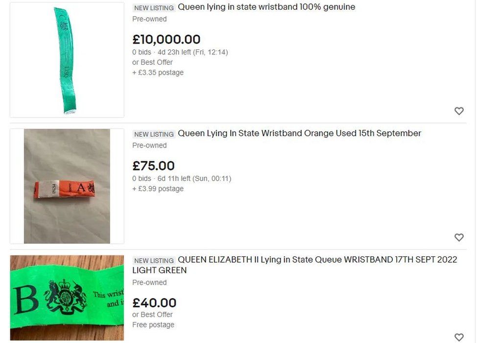 eBay interzice vânzarea brățărilor pentru a sta în coadă pentru a o vedea pe regină. Vânzătorii ofereau benzile colorate de hârtie, care marchează locul celor îndoliați în coadă ca suveniruri, scrie BBC.