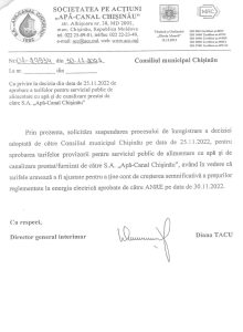 CMC aprobase tariful la apă fără avizul ANRE. Or, ANRE a emis un comunicat de presă după decizia CMC în care solicita încetarea declarațiilor manipulatoare și intensificarea panicii în municipiu de către S.A. „Apă-Canal Chișinău”. Presiunile publice ale operatorului de apă asupra regulatorului în scopul aprobării unui tarif lipsit de justificări economice sunt inadmisibile.