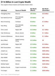 Ca rezultat, 17 dintre cei mai bogați investitori și fondatori din crypto au pierdut aproximativ $116 miliarde din averile personale din luna martie încoace, potrivit estimărilor Forbes. 15 dintre aceștia și-au pierdut peste jumătate din avere în ultimele nouă luni. 10 dintre aceștia și-au pierdut complet statutul de miliardar.
