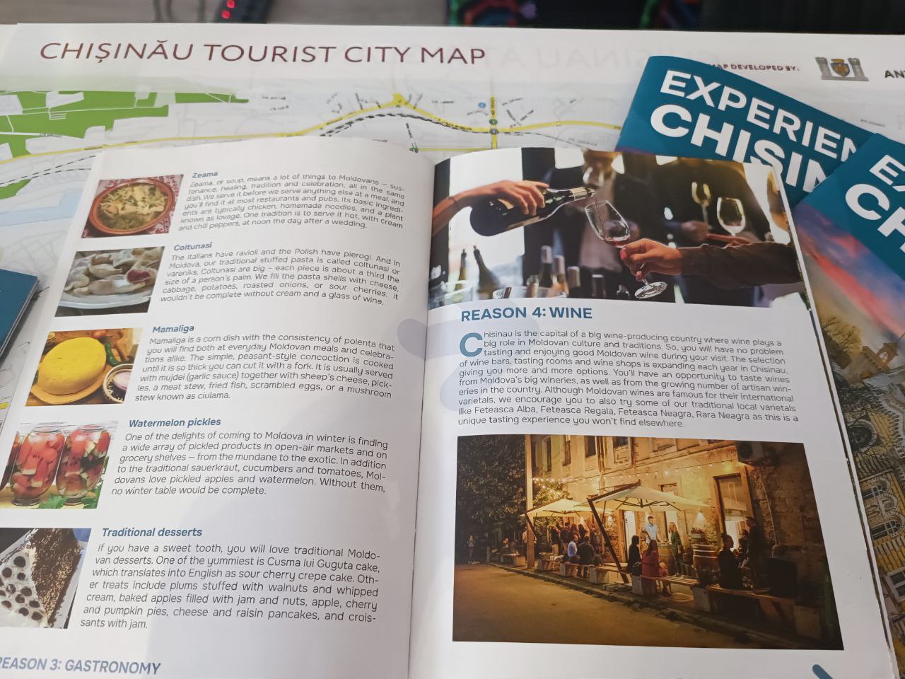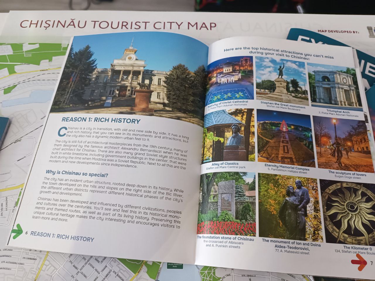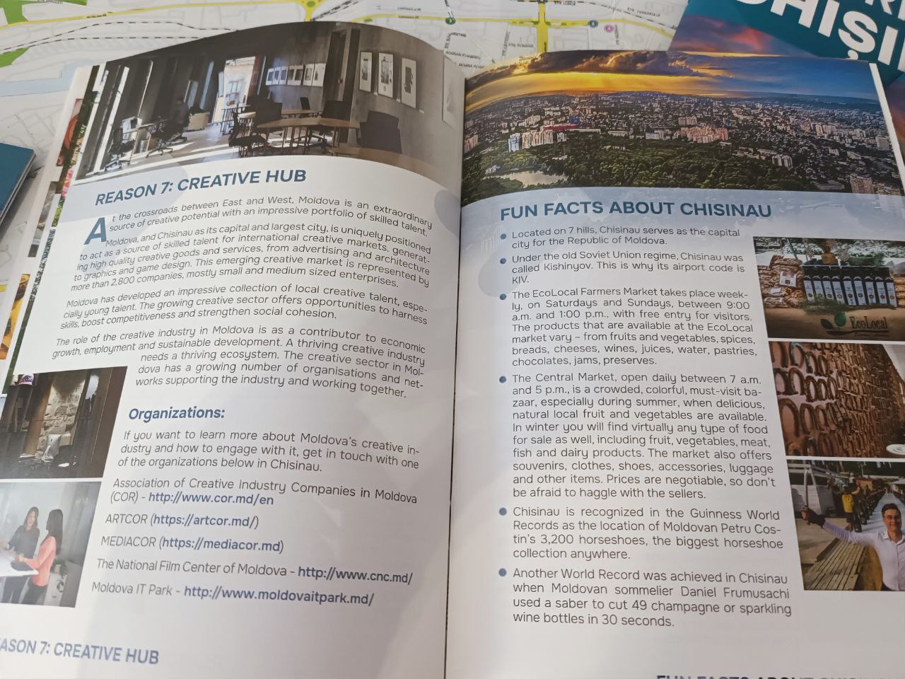 În broșură veți găsi 7 motive pentru a vizita orașul Chișinău, fiind prezentate atracții turistice, culturale și locuri unde poți descoperi gastronomia specifică țării noastre.
