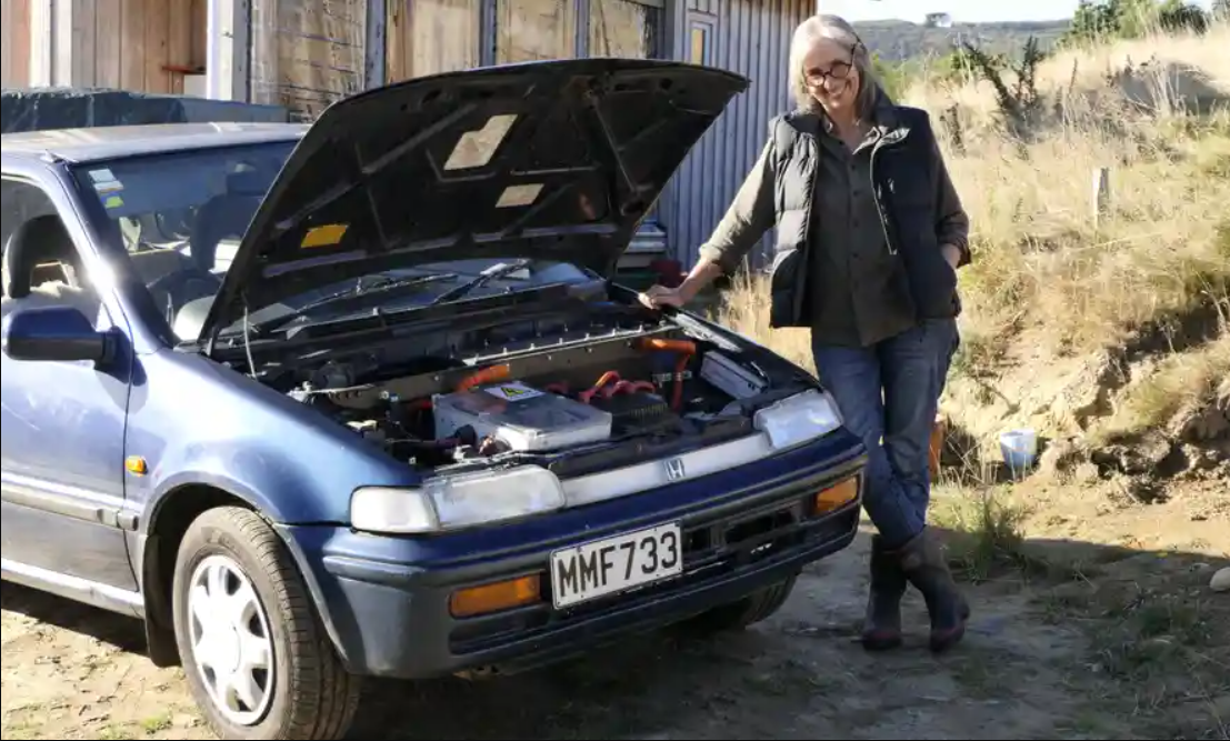 O femeie în vârstă de 63 de ani din Noua Zeelandă a transformat cu mâinile ei o rablă într-o mașină electrică, alimentată cu energie solară. Pentru a-și atinge obiectivul a lucrat 8 luni, fără să aibă cunoștinte de mecanică auto. Deja o conduce de trei ani și spune că funcționează fără probleme.