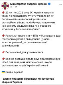 Sâmbătă dimineață, consilierul prezidențial Oleksii Arestovici informase că forțele ucrainene au lovit un post de comandă rusesc din zona Herson, unde se aflau circa 50 de ofițeri ruși.