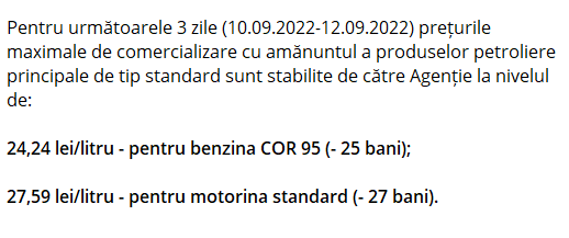 De menționat că, de la 1 septembrie 2021 au intrat în vigoare modificările la legea produselor petroliere. Așadar, ANRE stabilește prețurile plafon pentru benzina cu cifra octanică 95 și pentru motorină.