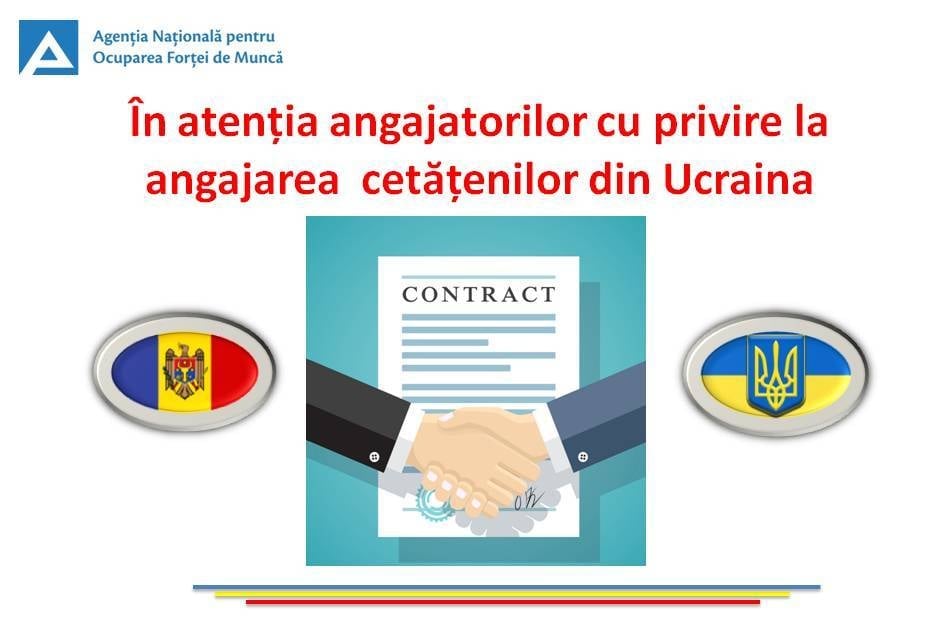 Ministerul Muncii și Protecției Sociale al Republicii Moldova anunță despre posibilitatea angajării cetățenilor ucraineni în câmpul muncii în țara noastră fără obținerea dreptului de ședere provizoriu. Angajarea se va face în baza contractului individual de muncă.