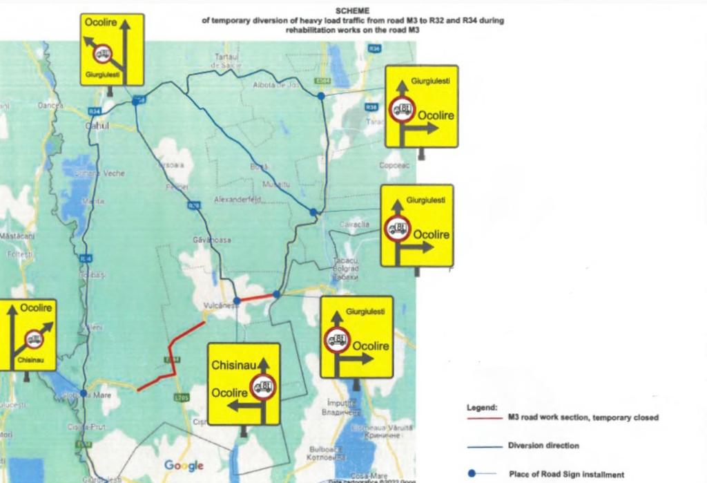 Î.S. „Administrația de Stat a Drumurilor” informează că traficul de camioane pe traseul M3 Chișinău-Giurgiulești va devia temporar, în contextul reabilitării porțiunii de drum. Astfel, a intervenit necesitatea de a devia temporar traficul de camioane cu masa totală mai mare de 8 tone de pe traseul M3 pe trasee alternative. Așadar, șoferilor de camioane le sunt propuse trasee alternative.